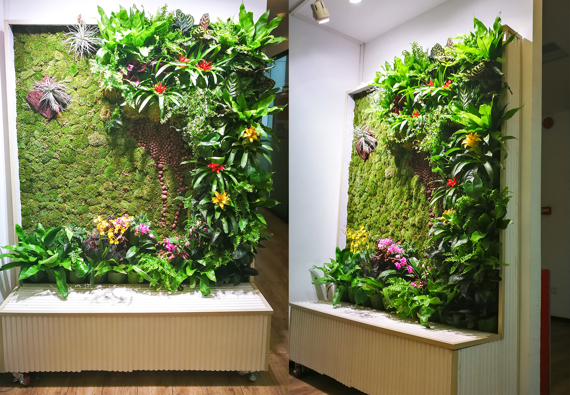 目前的苔蘚墻在立面上的固定方式尚不成熟,尤其是像白發蘚這類生長密集、墊狀叢生的苔蘚,隨著苔蘚層的加厚,容易在立面上脫落,同時還存在安裝拆卸不便的問題。本實用新型專利以此為突破口,顛覆了傳統垂直綠化模塊掛鉤式的固定方式,苔蘚墻成型后各模塊間獨立存在互不影響,解決了苔蘚墻模塊安裝拆卸不便和自然采集叢生類苔蘚易脫落等問題。