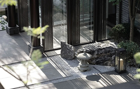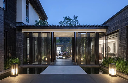 青磚黛瓦,雅致的建筑立面,大面積落地玻璃窗,模糊室內(nèi)外空間,院里綠意透入室內(nèi)。