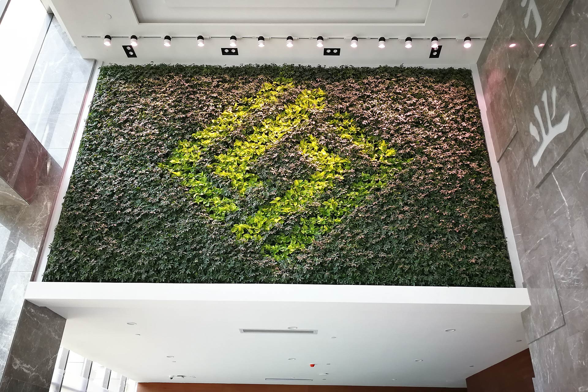 垂直綠化項目設計之一,在平緩的立面上用不同的植物組合形成不同的圖形和圖案,增添立體設計的效果。